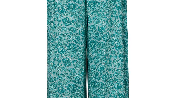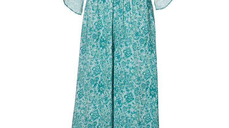 Kollektionen består av romantiska plagg i pastelltonerna korall och mint. Feminina snitt på byxor, byxdress, omlottkjol och långklänning går lätt att matcha med enfärgade toppar och mönstrade tunikor.