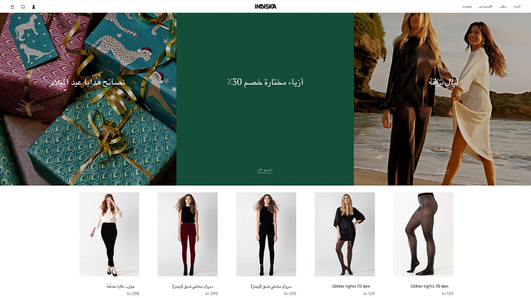 Indiska’s e-handel gör idag premiär på arabiska. Detta möjliggör ett nytt steg i Indiskas internationella expansion där översättning av den egna sajten samt försäljning på nya plattformar kommer att öka. Tillgängligheten på arabiska med möjlig handel i lokal valuta gör Indiska närmast unikt i detta hänseende.