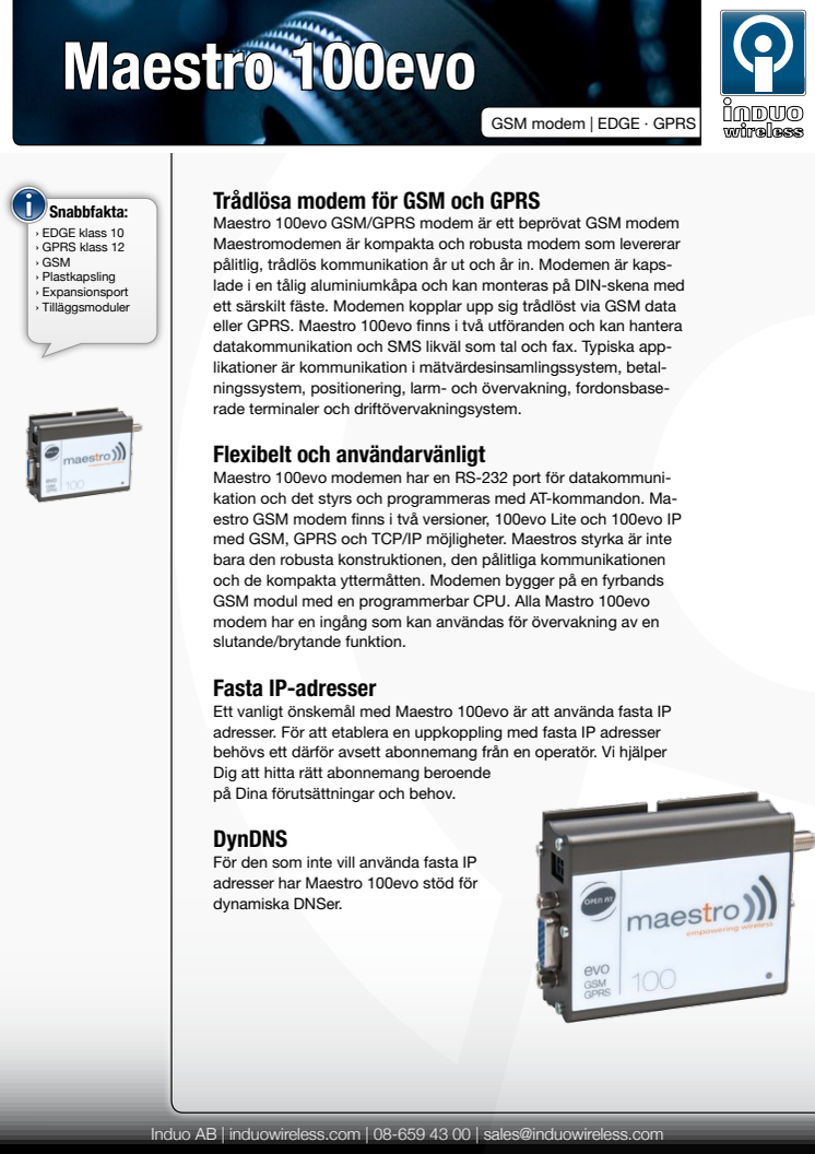 Maestro 100evo är ett GSM modem från Maestro Wireless med RS-232 port, strömsparläge och DynDNS, allt inrymt i en tålig metallkapsling.