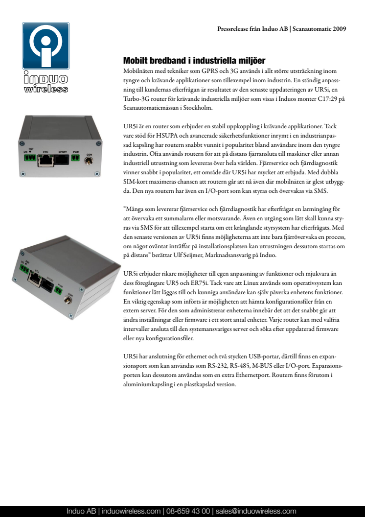 UR5i är en turbo 3G router med stöd för HSUPA som används i industriella applikationer. Routerns utökade egenskaper som breddar tillämpningarna inom bland annat industrin visas på Scanautomaticmässan i Stockholm.