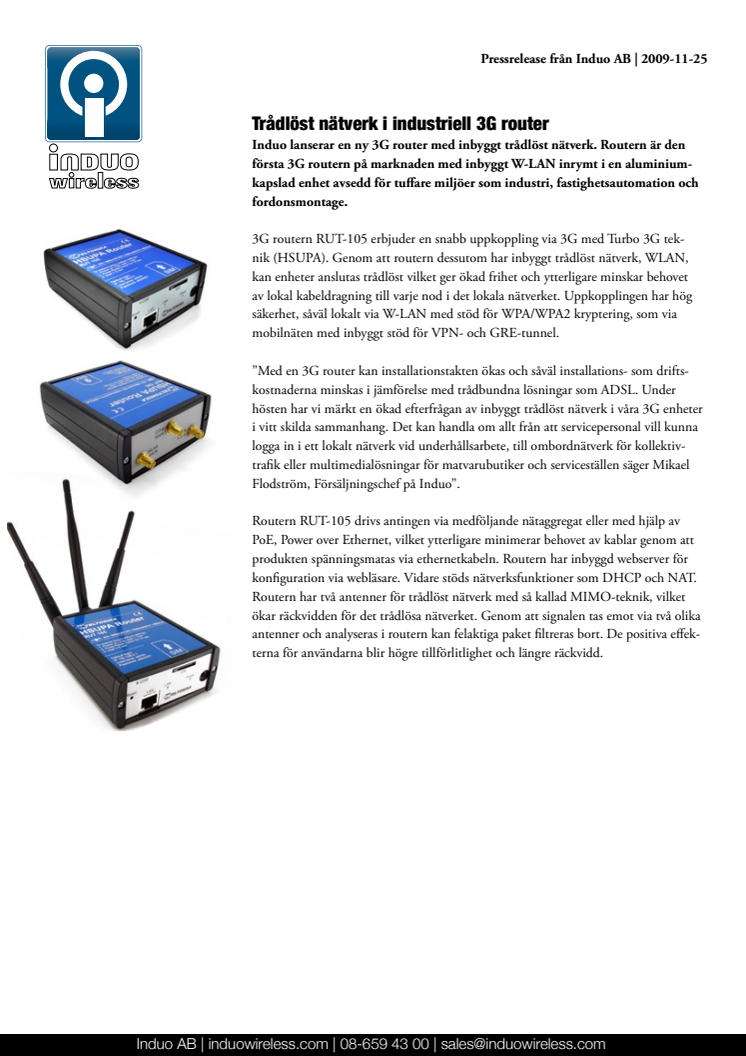 RUT-105 är en 3G routern med inbyggt WLAN som erbjuder trådlös 3G uppkoppling med HSUPA hastighet. Genom routerns inbyggda trådlösa nätverk kan enheter anslutas trådlöst vilket ger ökad frihet och ytterligare minskar behovet av lokal kabeldragnin g.Det kan handla om allt från att servicepersonal vill kunna logga in i ett lokalt nätverk vid underhållsarbete, till ombordnätverk för kollektivtrafik.