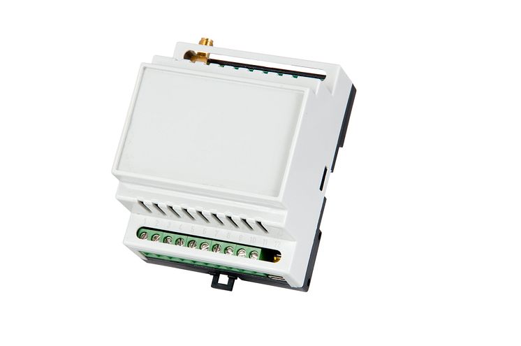 ESIM251 i kapsling som passar på DIN-skena och i normkapsling. Anslutning av funktioner sker via skruvplint i botten.
