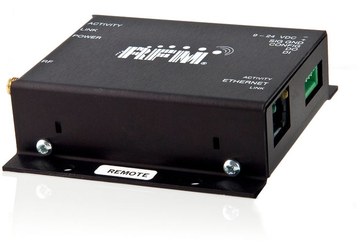 Aluminiumkapslad ethernetbrygga från RFM. RJ-45 anslutningsdon för ethernetkontakt, skruvplintsanslutning för spänningsmatning och konfiguration.