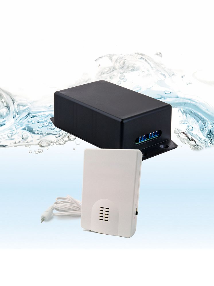 Läckagelarmet består av en fuktsensor med inbyggd siren och batteridrift. Denna kopplas till en SMS sändare som skickar SMS när larmet går.