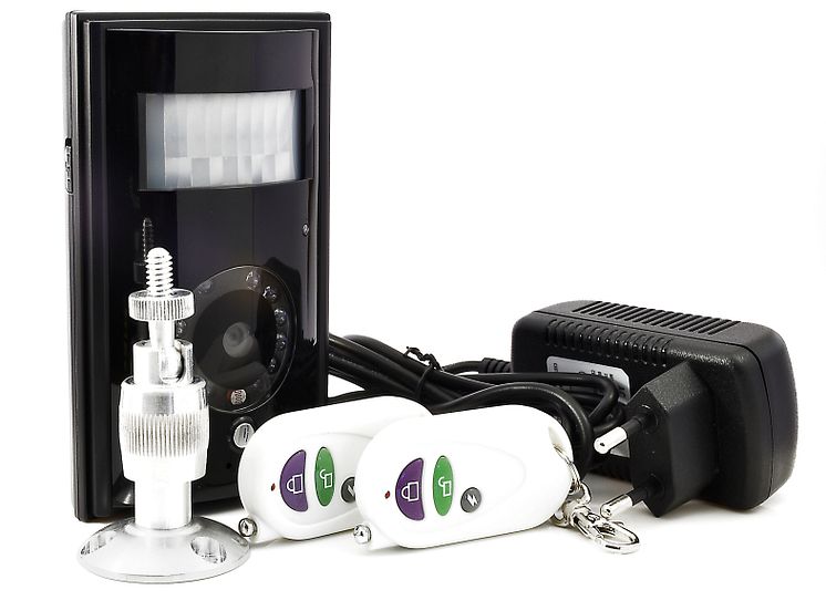 MMS kameran/MMS larmet från Induo levereras med fjärrkontroller, väggfäste och nätaggregat.