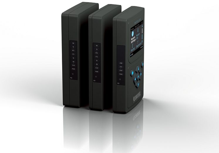 SATELLAR radiomodem från SATEL, här i SATELLINE-2DSd utförande sett från sidan för att bättre belysa modemets moduluppbyggnad. Den nya generationens radiomodem från SATEL har bland annat kryptering, ethernet och mjukvarustyrd radio.
