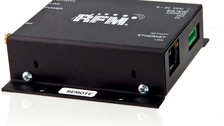 Aluminiumkapslad 2,4 GHz ethernetbrygga. Antennanslutning i ena kortänden, i den andra kortänden anslutning för spänningsmatning och ethernet.