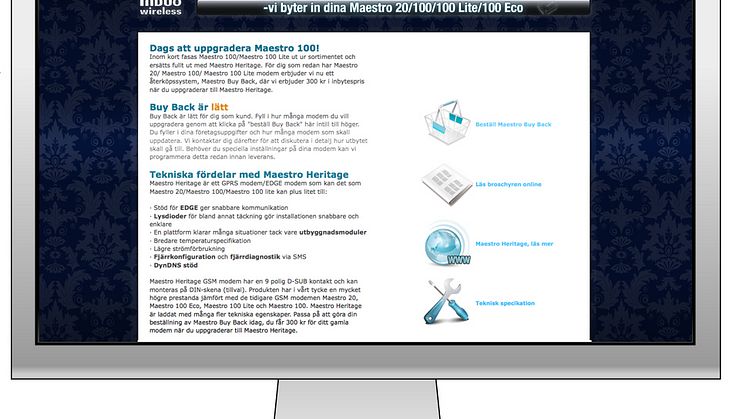 Maestro 100 serien utgår ur sortimentet och ersätts med Maestro Heritage, ett kompetent GPRS/EDGE modem med samma grundegenskaper som Maestro 100. Samtidigt så introducerar vi möjligheten till återköp av gamla Maestro GSM modem genom återköpsprogrammet Maestro Buy Back. Vi lämnar då upp till 300 kr rabatt på Maestro Heritage vid retur av Maestro 20, Maestro 100, -100 Lite eller -100 Eco GSM modem