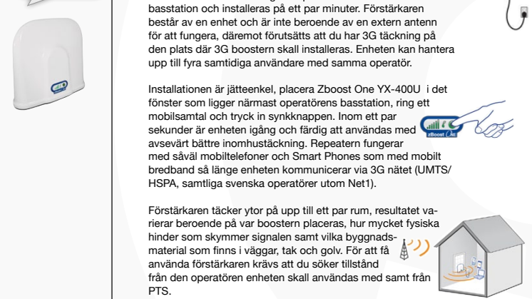 Den som har dålig 3G-täckning inomhus kan nu få bättre inomhustäckning för såväl mobiltelefoni som mobilt bredband. Induo presenterar Zboost One YX-400U från Wi-Ex, en 3G repeaterstation för hemanvändare och småföretag. Den fungerar i praktiken som en minibasstation och installeras på ett par minuter. Jämfört med tidigare lösningar på marknaden är Zboost billigare i inköp och enklare att installera.