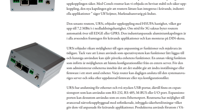 "Många kunder använder 3G uppkoppling för att fjärransluta till maskiner eller annan industriell utrustning som levereras över hela världen. Det kan handla om en lackeringsrobot som skall trimmas in, en pumpstation som skall övervakas eller en verktygsmaskin som skall fjärrservas. Kraven från dessa kunder är att produkten skall vara pålitlig och uppkopplingen säker. Med Conels routrar kan vi erbjuda en bevisat stabil och säker uppkoppling, den nya kapslingen gör att routern lättare kan integreras i krävande, industriella applikationer " säger Ulf Seijmer, Marknadsansvarig på Induo.