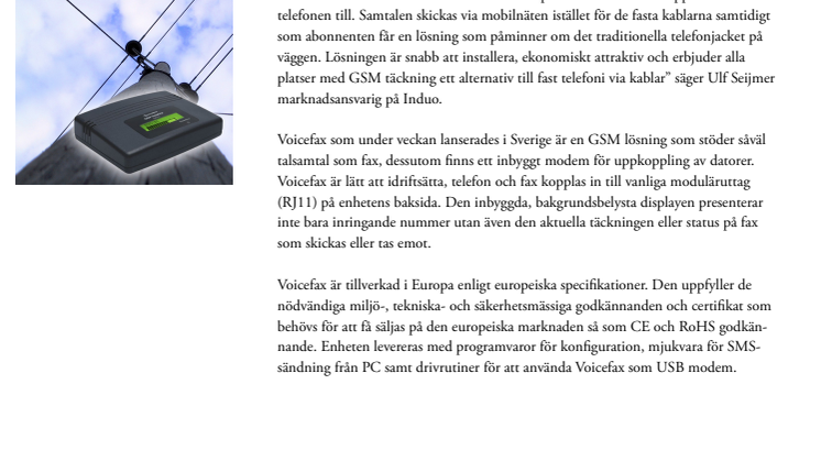 "Lösningen på problemet kan vara mycket enkel. Med vår produkt Voicefax kan operatörerna erbjuda en tjänst som liknar fast telefoni utan fasta telefonlinjer. Hemma hos abonnenten installleras en GSM baserad produkt som denne kopplar in den fasta telefonen till. Samtalen skickas via mobilnäten istället för de fasta kablarna samtidigt som abonnenten får en lösning som påminner om det traditionella telefonjacket på väggen. Lösningen är snabb att installera, ekonomiskt attraktiv och erbjuder alla platser med GSM täckning ett alternativ till fast telefoni via kablar" säger Ulf Seijmer marknadsansvarig på Induo.