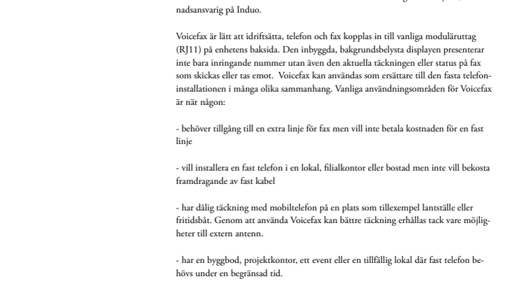 ”Mobila växellösningar och användande av mobiltelefoni har aldrig varit större, därför är vi övertygade att Voicefax ligger rätt i tiden. Med Voicefax kan kostnader sparas både i befintliga anläggningar och vid nyinstallation. Enheten kommunicerar via GSM och är lätt att installera av i stort sett vem som helst” säger Ulf Seijmer, marknadsansvarig på Induo.