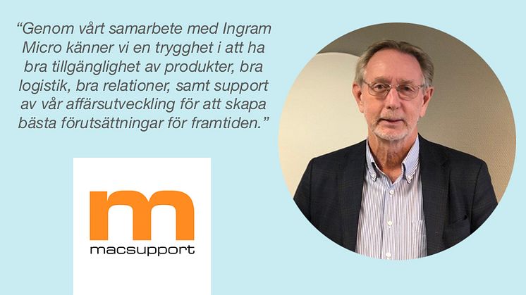 ”Macsupport är en av de kunder med störst penetration på marknaden och samtidigt bra geografisk spridning. Kombinationen av att vara ett bolag i den storleken och att leverera premiumupplevelse gör detta till en spännande utmaning för oss. Ingram Micro har en ständig tillväxt i bolaget och samarbetet med Macsupport ligger helt i linje med vår långsiktiga strategi.”