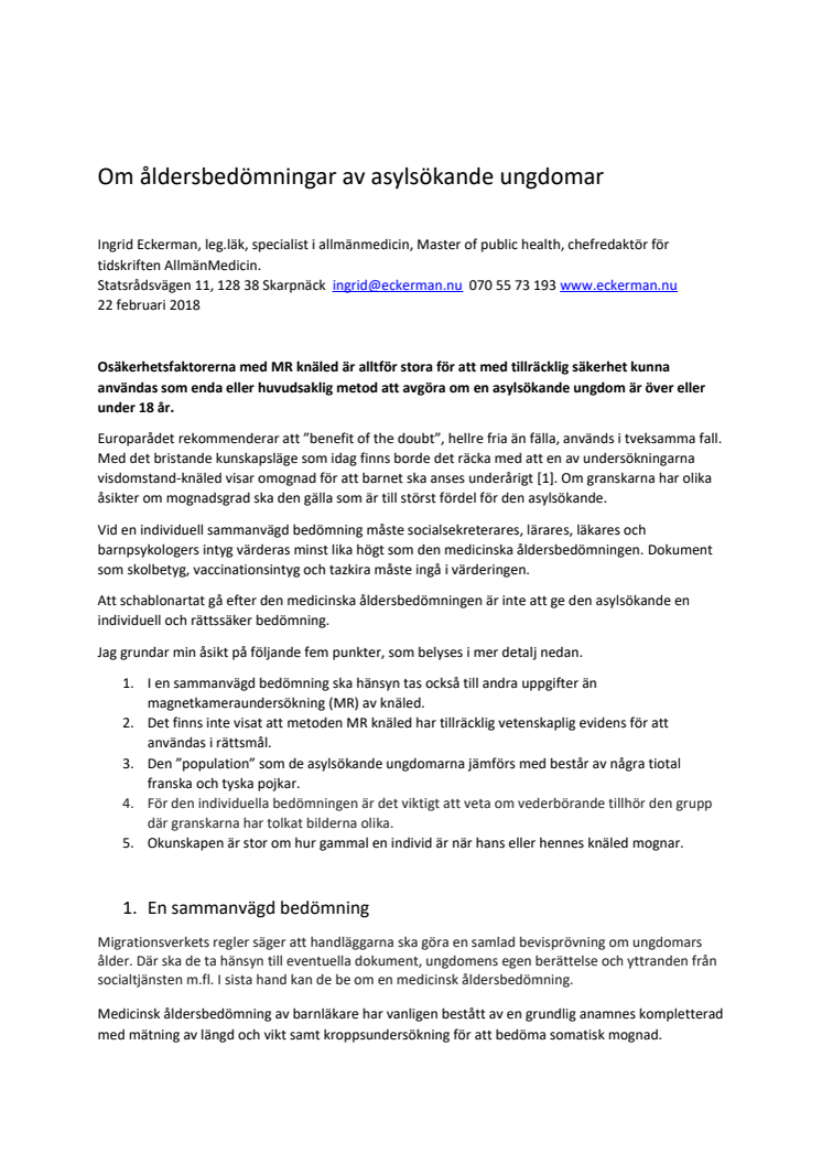 En sammanställning av diskussionerna i media om medicinsk åldersbedömning visar att osäkerheten med MR knäled är alltför stor för att metoden ska användas som enda eller huvudsaklig metod att avgöra om en asylsökande ungdom är över eller under 18 år.