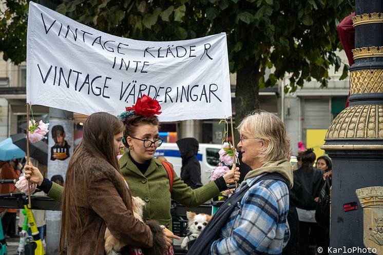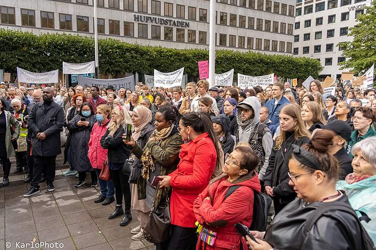 Vänsterpartiet Storstockholm hade tagit initiativ till demonstrationen, men ett stort antal organisationer hörsammade inbjudan. Bland talarna märktes Per Bolund från Miljöpartiet. I vimlet märktes fanns även sångerskan Siv Malmkvist.
