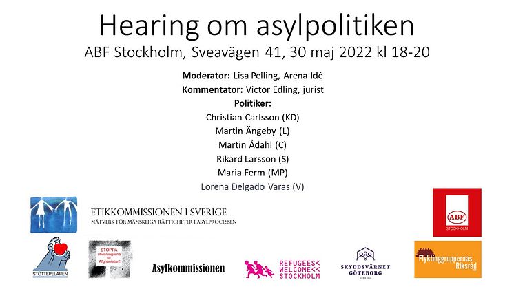 Sex av åtta riksdagspartier kommer att delta i kvällens hearing om asylpolitiken på ABF Stockholm, Sveavägen 41, kl 18-20.