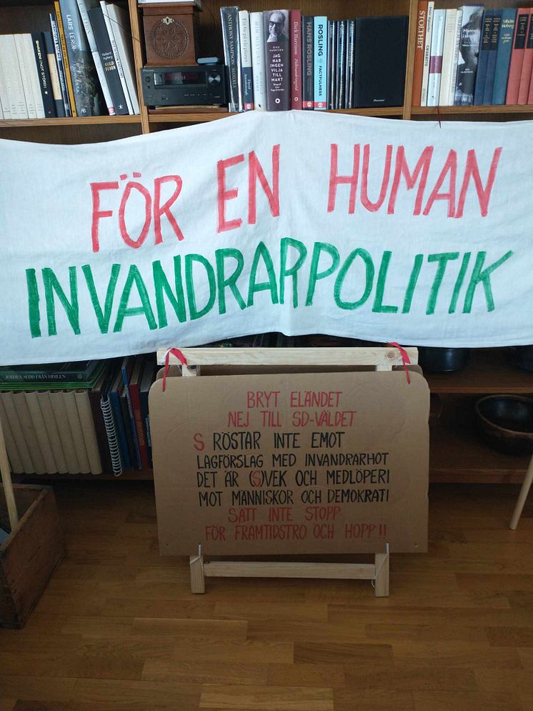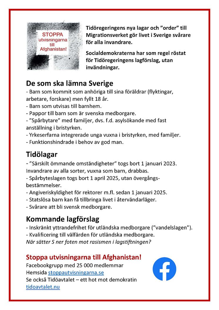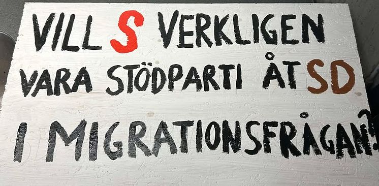 I ett av flygbladen ställs frågan ”När sätter Socialdemokraterna ner foten mot rasismen i lagstiftningen?” Ingrid Eckerman, som företräder både nätverket Stoppa utvisningarna till Afghanistan! med 25 000 medlemmar och föreningen Stöttepelaren, förklarar.