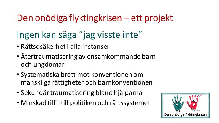 Temat för årets konferens var barnkonventionen, och föreläsarna anlade också barnperspektiv vid sin presentation av innehållet boken. Barnkonventionen är svensk lag sedan 1 januari 2020. Det är uppenbart att Sverige, när det gäller flyktingbarn, medvetet bryter mot en rad artiklar i barnkonventionen.