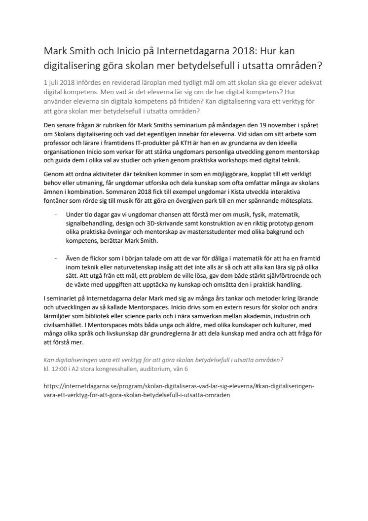 Kan digitalisering vara ett verktyg för att göra skolan mer betydelsefull i utsatta områden - det är frågan för professor Mark Smiths seminarium på Internetdagarna, i spåret den 19 november om Skolans digitalisering och vad det egentligen innebär för eleverna. Mark Smith är medgrundare av Inicio som verkar för att guida ungdomar till yrkesval eller studier genom mentorskap och digital kompetens.