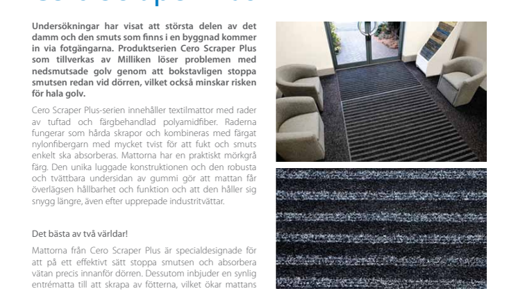 Undersökningar har visat att största delen av det damm och den smuts som finns i en byggnad kommer in via fotgängarna. Produktserien Cero Scraper Plus som tillverkas av Milliken löser problemen med nedsmutsade golv genom att bokstavligen stoppa smutsen redan vid dörren, vilket också minskar risken för hala golv.