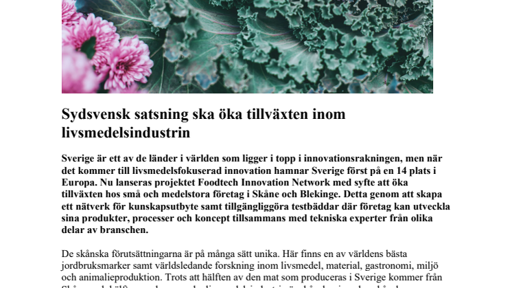 Sverige är ett av de länder i världen som ligger i topp i innovationsrakningen, men när det kommer till livsmedelsfokuserad innovation hamnar Sverige först på en 14 plats i Europa. Nu lanseras projektet Foodtech Innovation Network med syfte att öka tillväxten hos små och medelstora företag i Skåne och Blekinge. Detta genom att skapa ett nätverk för kunskapsutbyte samt tillgängliggöra testbäddar där företag kan utveckla sina produkter, processer och koncept tillsammans med tekniska experter från olika delar av branschen.