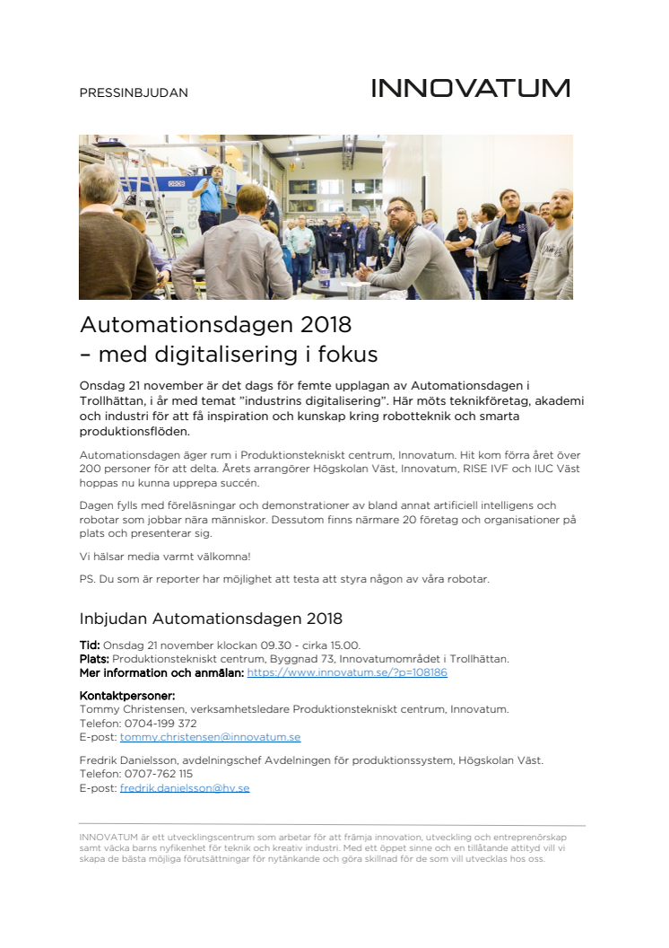 Onsdag 21 november är det dags för Automationsdagen i Trollhättan, i år med temat ”industrins digitalisering”. Här möts teknikföretag, akademi och industri för att få inspiration och kunskap. Dagen fylls med föreläsningar och demonstrationer av bland annat artificiell intelligens och robotar som jobbar nära människor.