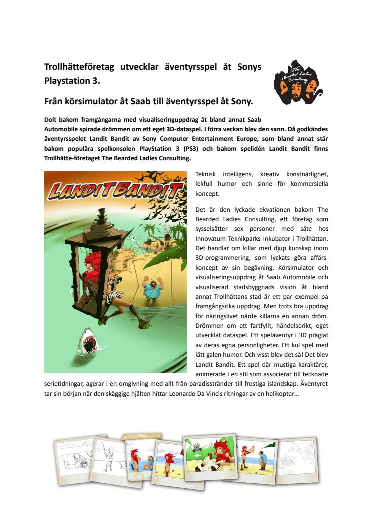 Dolt bakom framgångarna med visualiseringuppdrag åt bland annat Saab Automobile spirade drömmen om ett eget 3D-dataspel. I förra veckan blev den sann. Då godkändes äventyrsspelet Landit Bandit av Sony Computer Entertainment Europe, som bland annat står bakom populära spelkonsolen PlayStation 3 (PS3). Bakom spelidén Landit Bandit finns Trollhätteföretaget The Bearded Ladies Consulting.