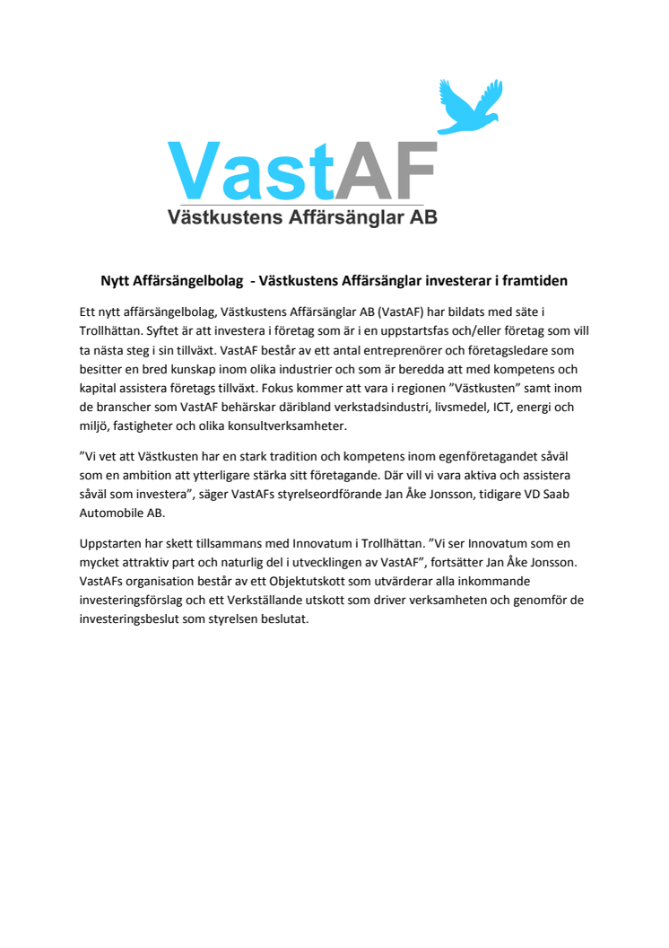 Ett nytt affärsängelbolag, Västkustens Affärsänglar AB (VastAF) har bildats med säte i Trollhättan. Syftet är att investera i företag i uppstartsfas och/eller företag som vill ta nästa steg i sin tillväxt. VastAF består av ett antal entreprenörer och företagsledare som besitter en bred kunskap inom olika industrier och som är beredda att med kompetens och kapital assistera företags tillväxt.