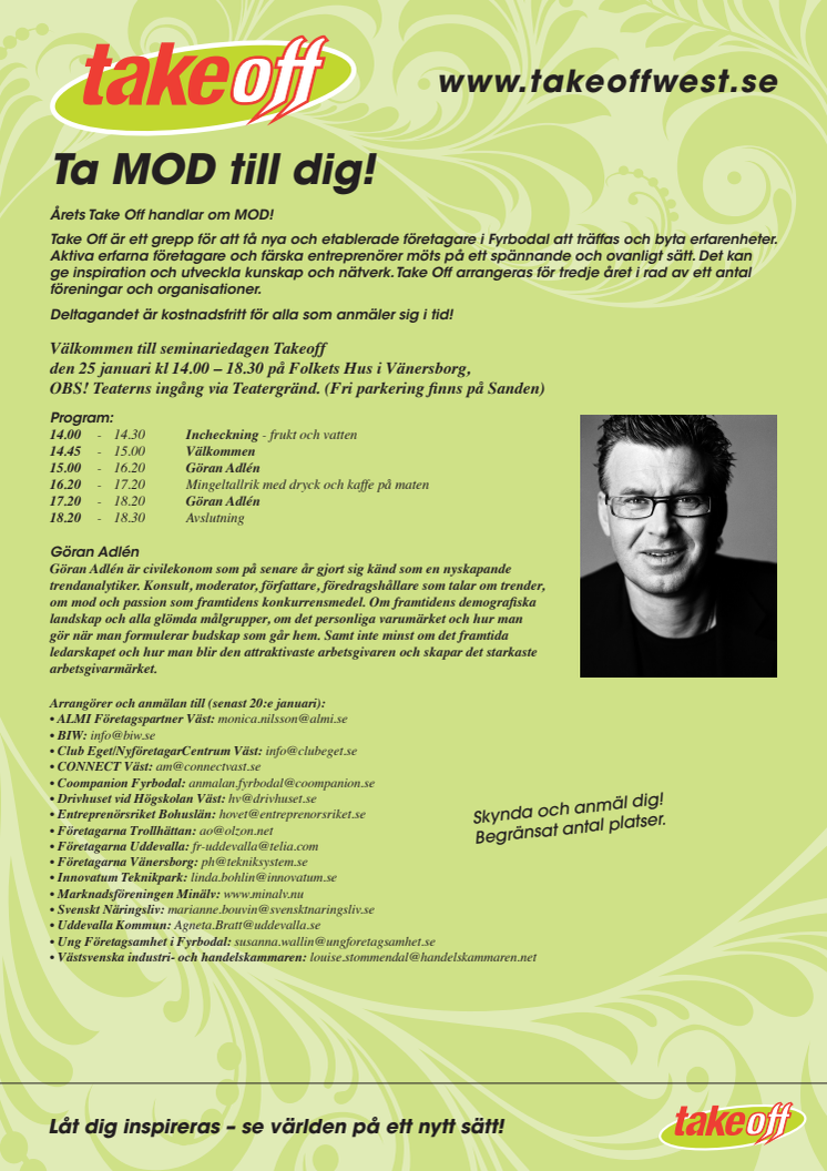 Take Off är ett grepp för att få nya och etablerade företagare i Fyrbodal att träffas och byta erfarenheter. Aktiva erfarna företagare och färska entreprenörer möts på ett spännande och ovanligt sätt. Det kan ge inspiration och utveckla kunskap och nätverk. Take Off arrangeras för tredje året i rad av ett antal föreningar och organisationer.