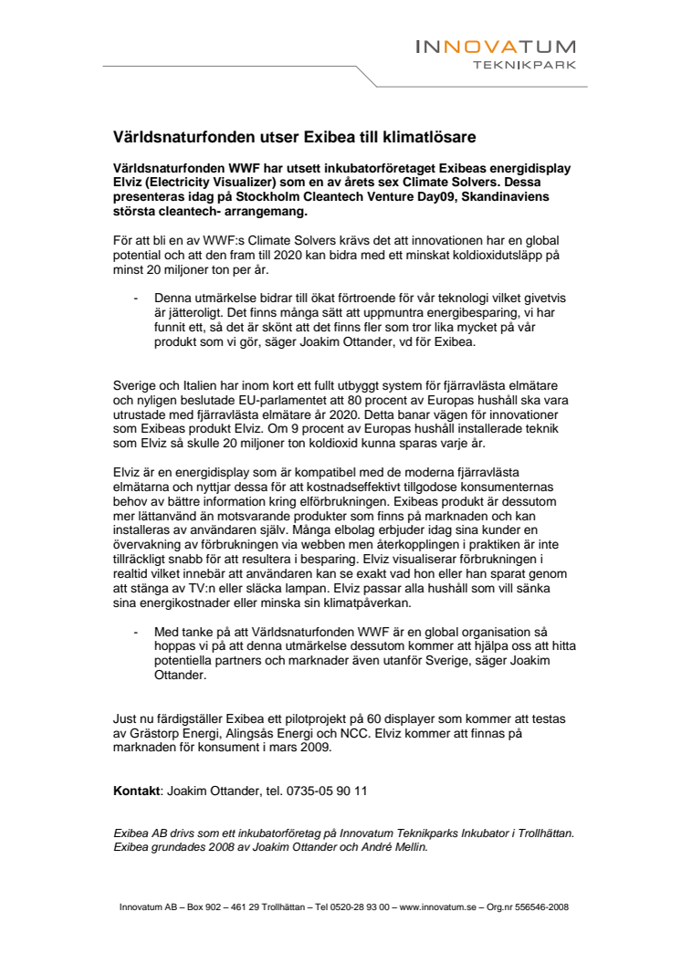 Världsnaturfonden WWF har utsett inkubatorföretaget Exibeas energidisplay Elviz (Electricity Visualizer) som en av årets sex Climate Solvers. Dessa presenteras idag på Stockholm Cleantech Venture Day09, Skandinaviens största cleantech- arrangemang.
