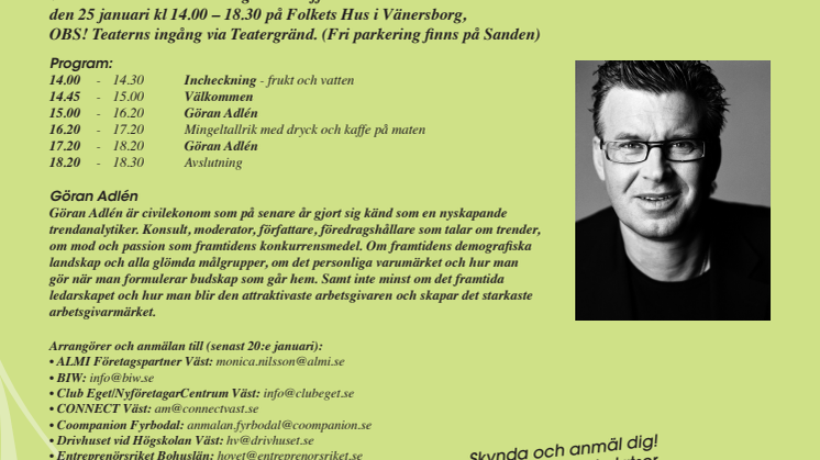 Göran Adlén är civilekonom som på senare år gjort sig känd som en nyskapande trendanalytiker. Konsult, moderator, författare, föredragshållare som talar om trender, om mod och passion som framtidens konkurrensmedel. Om framtidens demografiska landskap och alla glömda målgrupper, om det personliga varumärket och hur man gör när man formulerar budskap som går hem. Samt inte minst om det framtida ledarskapet och hur man blir den attraktivaste arbetsgivaren och skapar det starkaste arbetsgivarmärket.