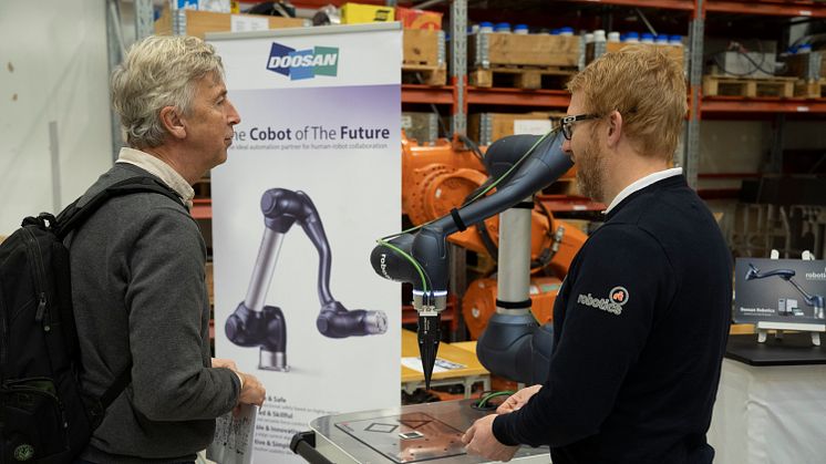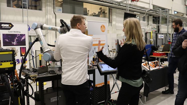 Stämningen är hög i Produktionstekniskt centrum där ett 20-tal utställare visar upp en härlig mix av bland annat robotar, automationsutrustning, nya produkter, tjänster och koncept för kompetensutveckling att inspireras av. I minglet möts branschkollegor, leverantörer, studenter och forskare för att diskutera och ta del av nya tekniklösningar och tjänster