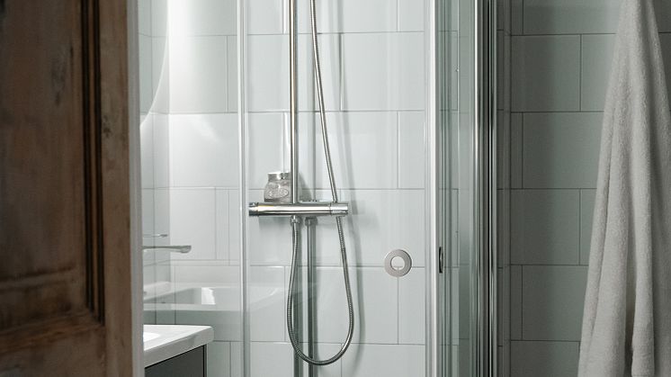 "Duschväggen med den dolda förvaringen är så smart. Det är så skönt att slippa ha flaskorna stående på golvet. Att duschdörrarna går att vika dubbelt är också ett stort plus i vårt lilla badrum."