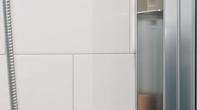 Duschförvaringen Pile installeras i duschväggens profil.