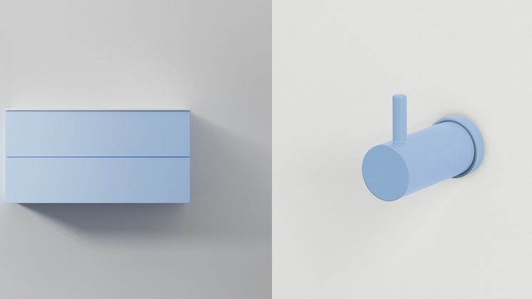 Handdukstorken lät vi gå ton i ton med väggen i en ljusare blå kulör för ett modernt och stilsäkert uttryck. Line handdukstork i NCS S 2040-R80B.
