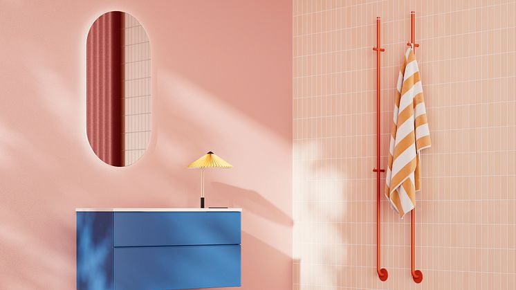 En finstämd färgfest i rött, orange och gult med blått som kontrast. Viskan Shade 100 i NCS S 2060-R80B. Handdukstork Line i NCS S 0585-Y70R.