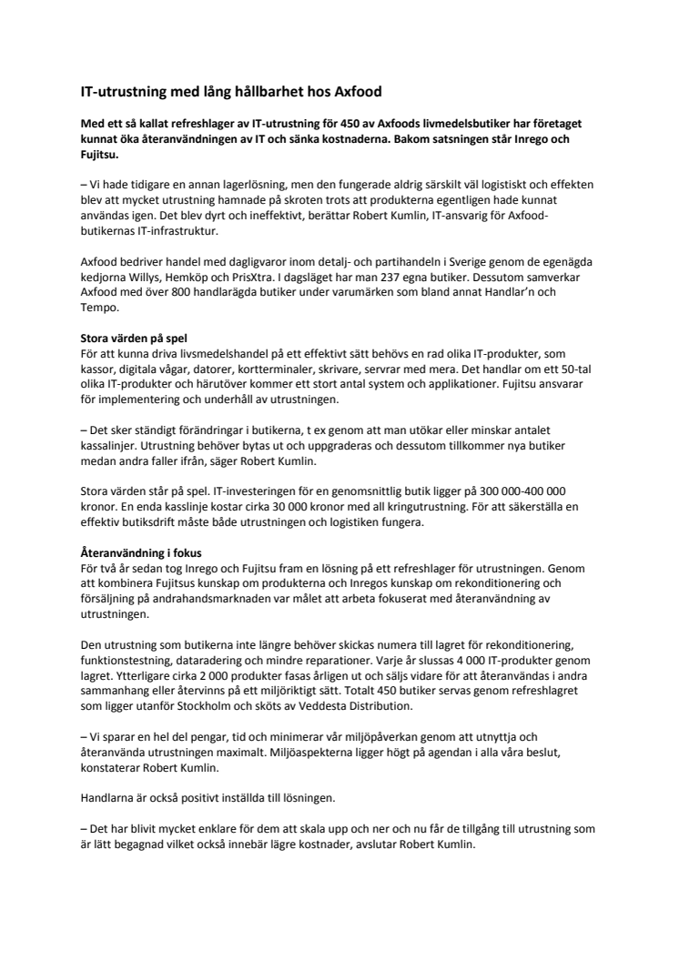 Med ett så kallat refreshlager av IT-utrustning för 450 av Axfoods livmedelsbutiker har företaget kunnat öka återanvändningen av IT och sänka kostnaderna. Bakom satsningen står Inrego och Fujitsu.