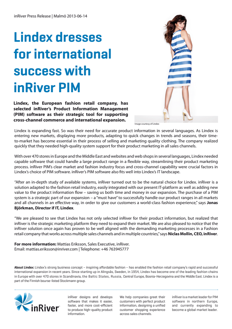 Lindex, the European fashion retail company, has selected inRiver’s Product Information Management (PIM) software as their strategic tool for supporting cross-channel commerce and international expansion.