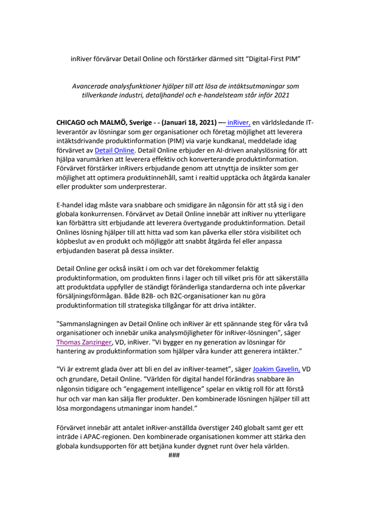 • inRiver förvärvar Detail Online och förstärker därmed sitt “Digital-First PIM”