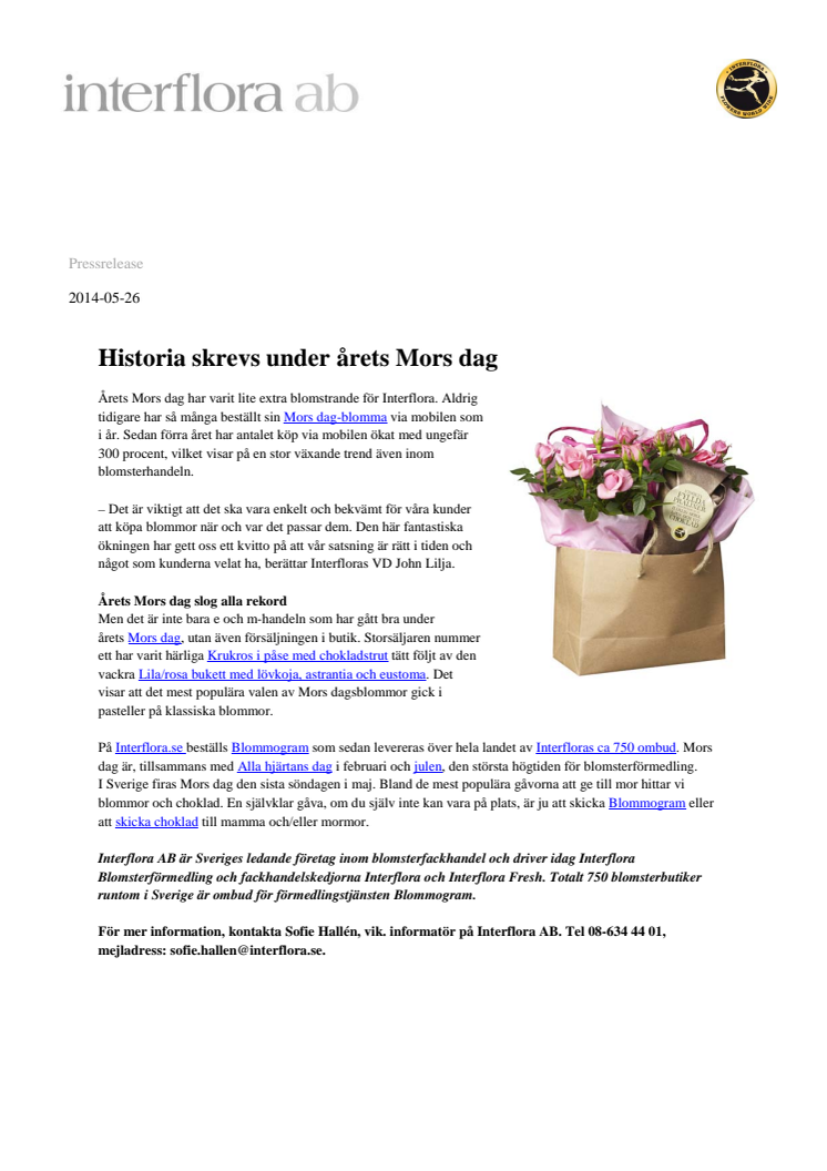 Årets Mors dag har varit lite extra blomstrande för Interflora. Aldrig tidigare har så många beställt sin Mors dag-blomma via mobilen som i år. Sedan förra året har antalet köp via mobilen ökat med ungefär 300 procent, vilket visar på en stor växande trend även inom blomsterhandeln.