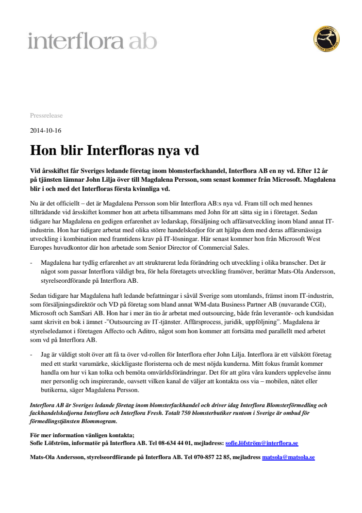 Vid årsskiftet får Sveriges ledande företag inom blomsterfackhandel, Interflora AB en ny vd. Efter 12 år på tjänsten lämnar John Lilja över till Magdalena Persson, som senast kommer från Microsoft. Magdalena blir i och med det Interfloras första kvinnliga vd.