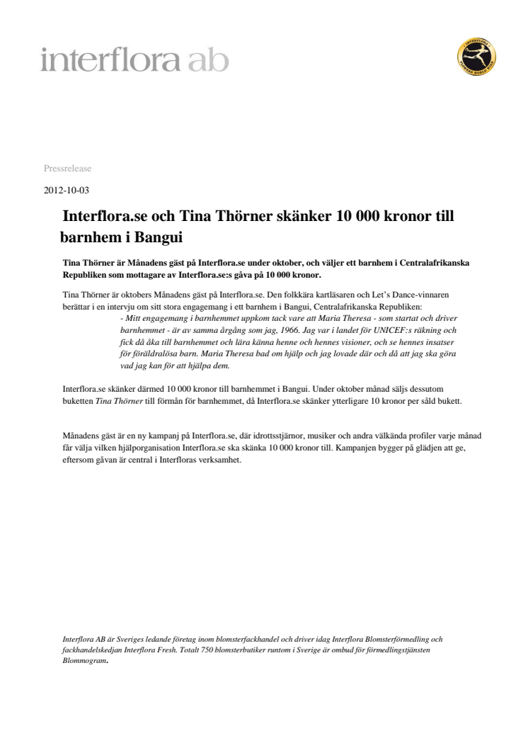 Tina Thörner gästar Interflora.se under oktober, och väljer ett barnhem i Centralafrikanska Republiken som mottagare av Interflora.se:s gåva på 10 000 kronor.