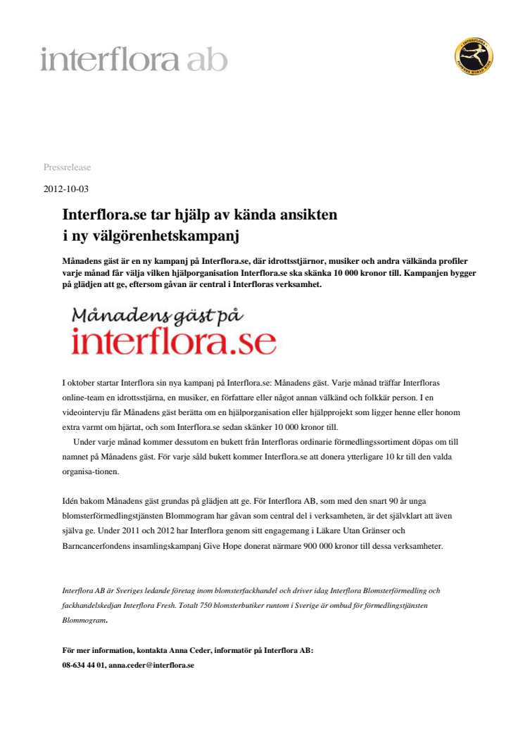 Månadens gäst är en ny kampanj på Interflora.se, där idrottsstjärnor, musiker och andra välkända profiler varje månad får välja vilken hjälporganisation Interflora.se ska skänka 10 000 kronor till. Kampanjen bygger på glädjen att ge, eftersom gåvan är central i Interfloras verksamhet.