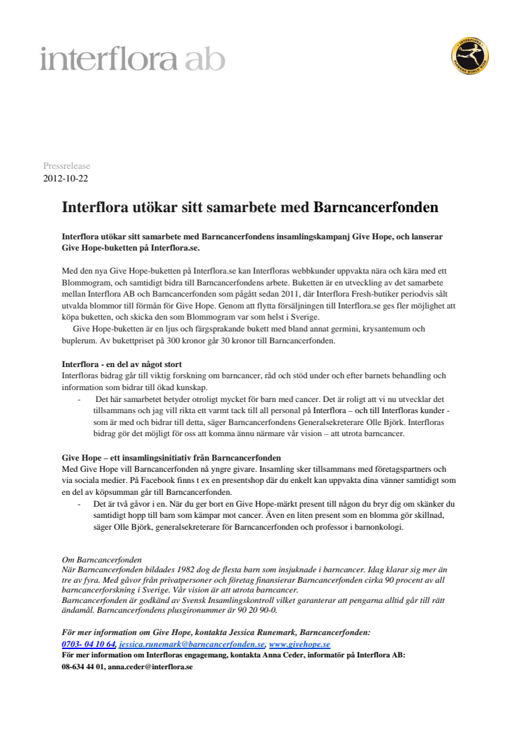 Interflora utökar sitt samarbete med Barncancerfondens insamlingskampanj Give Hope, och lanserar Give Hope-buketten på Interflora.se.
