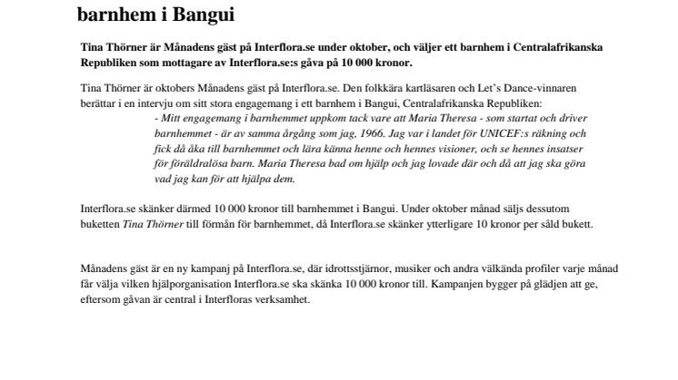 Interflora.se skänker därmed 10 000 kronor till barnhemmet i Bangui. Under oktober månad säljs dessutom buketten Tina Thörner till förmån för barnhemmet, då Interflora.se skänker ytterligare 10 kronor per såld bukett.