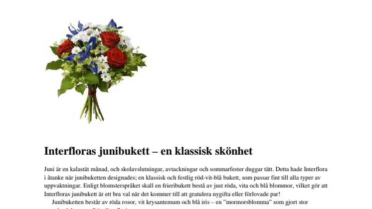 Juni är en kalastät månad, och skolavslutningar, avtackningar och sommarfester duggar tätt. Detta hade Interflora i åtanke när junibuketten designades; en klassisk och festlig röd-vit-blå bukett, som passar fint till alla typer av uppvaktningar. Enligt blomsterspråket skall en frieribukett bestå av just röda, vita och blå blommor, vilket gör att Interfloras junibukett är ett bra val när det kommer till att gratulera nygifta eller förlovade par!