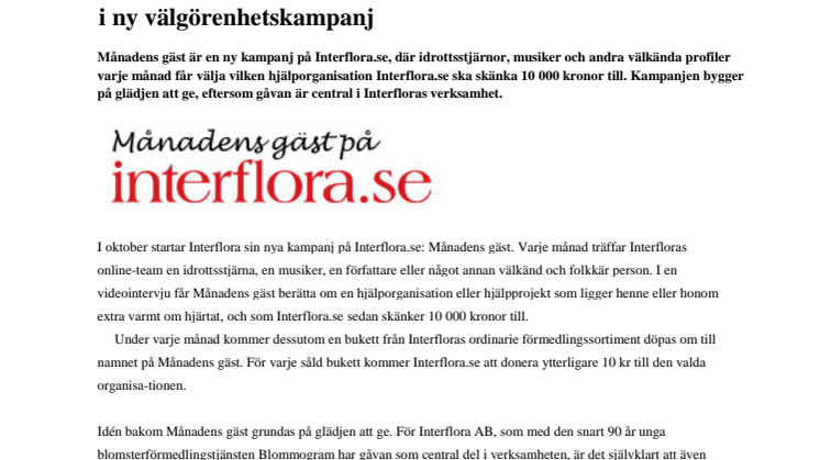 I oktober startar Interflora sin nya kampanj på Interflora.se: Månadens gäst. Varje månad träffar Interfloras online-team en idrottsstjärna, en musiker, en författare eller något annan välkänd och folkkär person. I en videointervju får Månadens gäst berätta om en hjälporganisation eller hjälpprojekt som ligger henne eller honom extra varmt om hjärtat, och som Interflora.se sedan skänker 10 000 kronor till.
