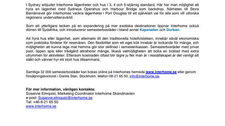 Semesterbostäder i Australien och Sydafrika lanseras av Interhome