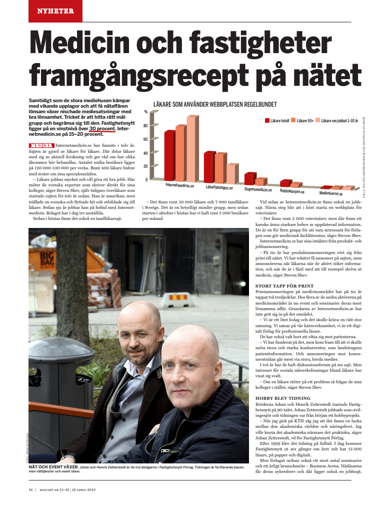 Det skrivs positivt om internetmedicin.se i media igen. Denna gång är det Resumé som uppmärksammar framgången för internetmedicin.se. Artikeln tar upp sajtens framgångskoncept, den stora besökstrafiken, skiftet från print- till nätannonsering och Internetmedicins satsningar på webbplatser för tandläkare och veterinärer.