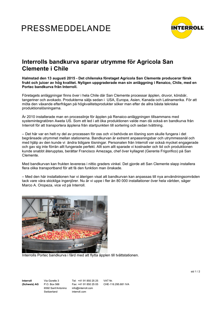 Det chilenska företaget Agricola San Clemente producerar färsk frukt och juicer av hög kvalitet. Nyligen uppgraderade man sin anläggning i Renaico, Chile, med en Portec bandkurva från Interroll.
